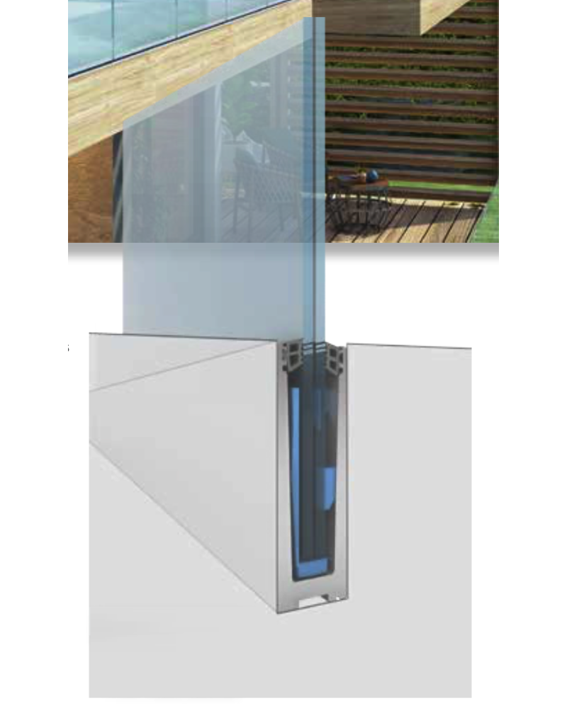Mit einem Bodenprofil aus einer Aluminiumlegierung nach EN AW 6063 bietet das Glasgeländer F1300 eine solide und zuverlässige Grundlage, auf der das Sicherheitsglas befestigt wird. Sein Zubehör wie die seitlichen Bodenprofile, die Endkappen oder die zertifizierten Anker M10x150, M10x110 und M5x50 ermöglichen eine schnelle und dauerhafte Verbindung der verschiedenen Elemente des Geländers.