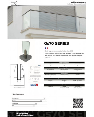Imaginez un garde-corps qui se fond dans le décor, laissant toute la place à la beauté de votre espace... C'est la promesse du GS70. Ce système innovant utilise de fines pinces en acier inoxydable pour maintenir le verre, offrant une vue dégagée et une esthétique minimaliste. Laissez la lumière inonder votre terrasse, sécurisez votre piscine avec style, sublimez votre balcon avec une touche de modernité... Le GS70 est la solution idéale pour créer un environnement à la fois beau et sûr.