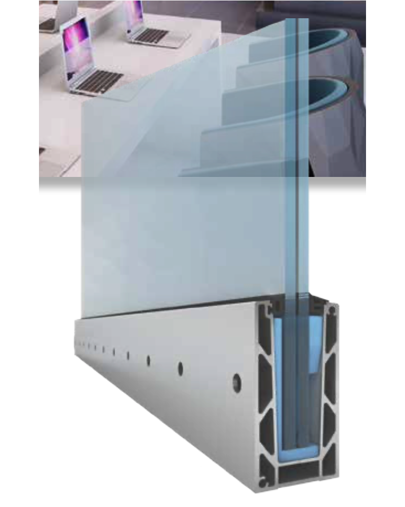 Le garde-corps en verre E115 disponible sur Railing-glass.com est constitué d'un profil de base en alliage d'aluminium de section rectangulaire de 115 mm x 50 mm. L’alliage EN AW 6063 offre une grande résistance mécanique tout en limitant le poids.