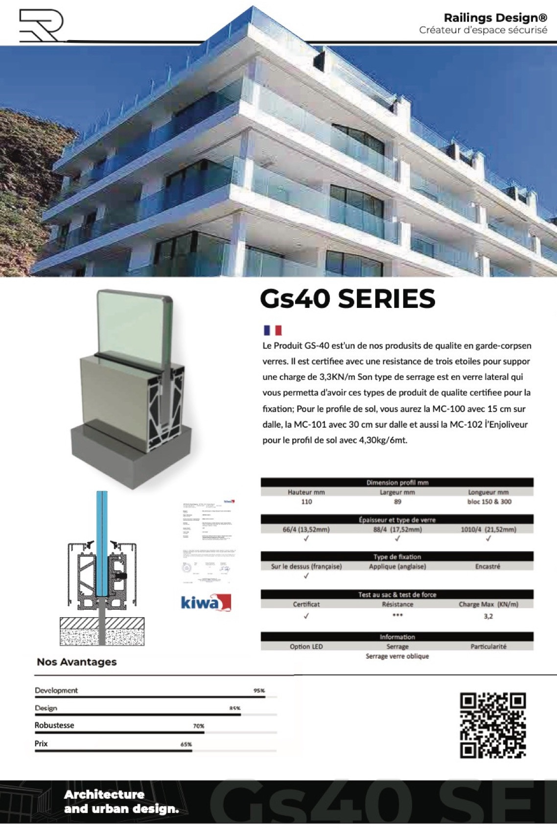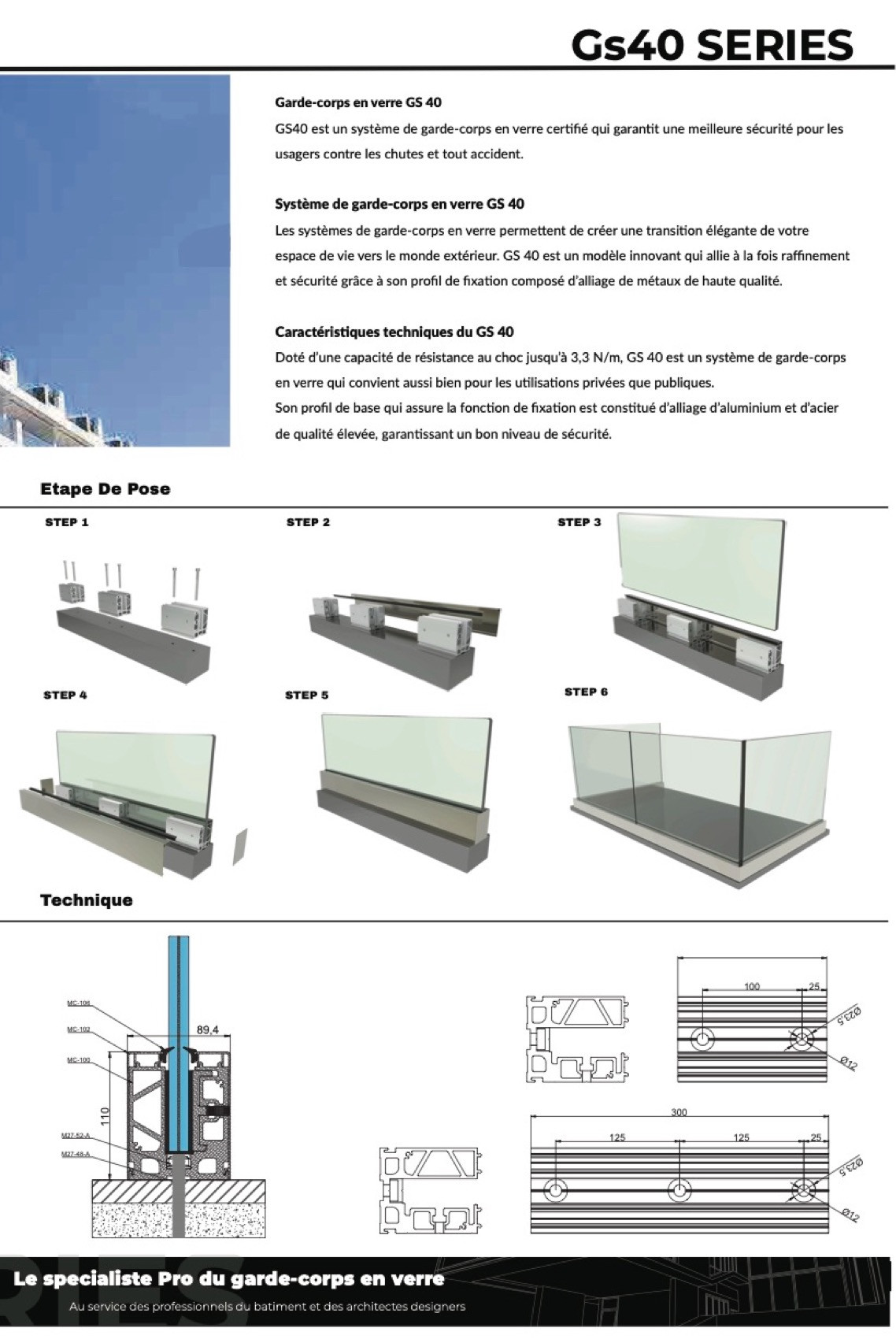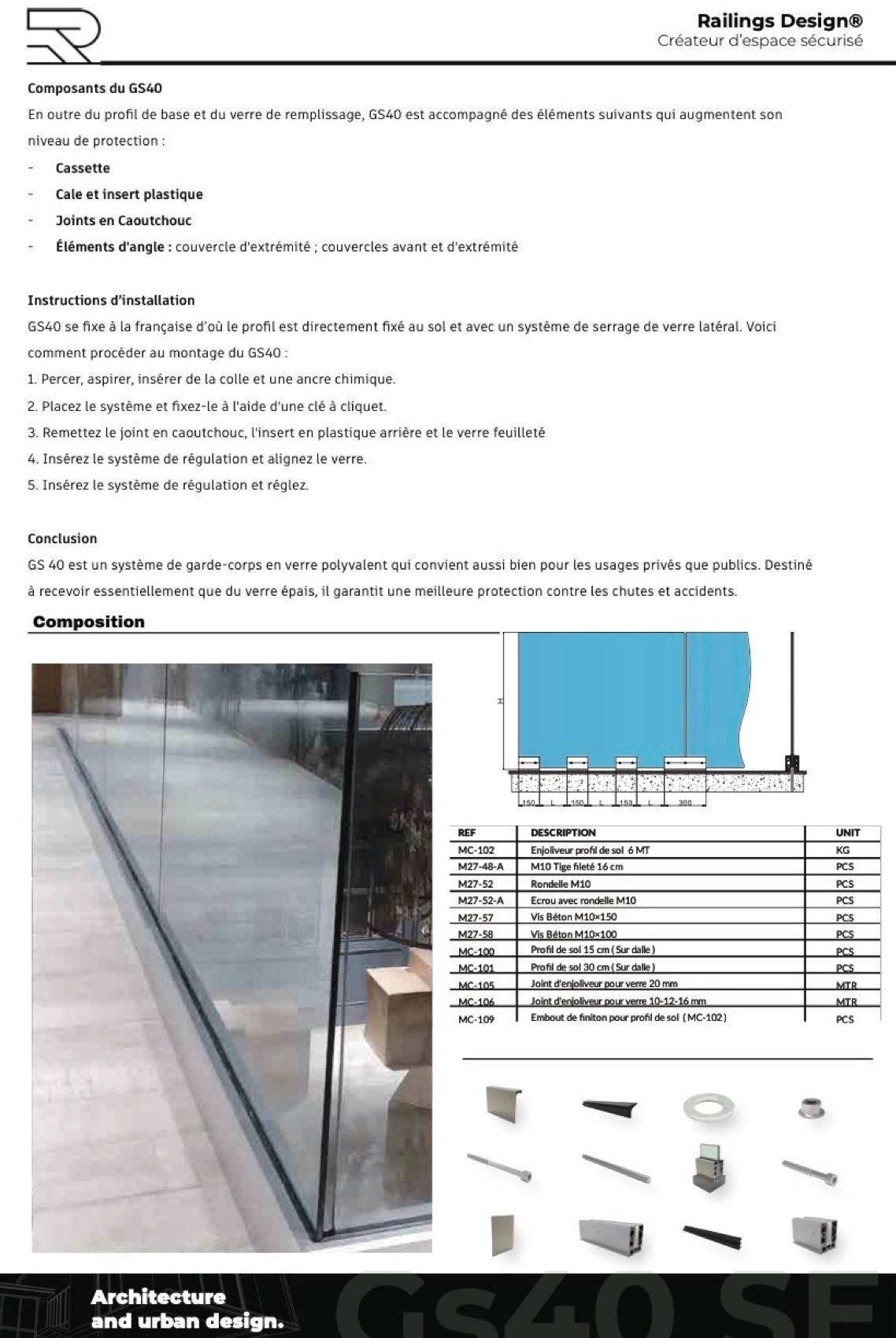 GS40 is a glass railing system designed to meet the needs of building professionals and designer architects. Suitable for both private and public use, it offers optimum safety while enhancing the aesthetics of your projects. Its versatility and ease of installation make it the ideal choice for securing spaces with style.