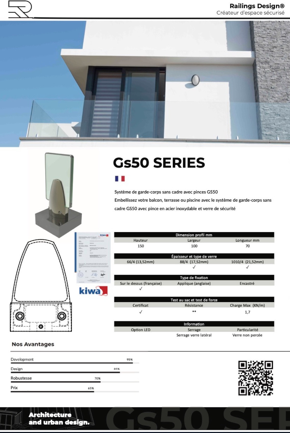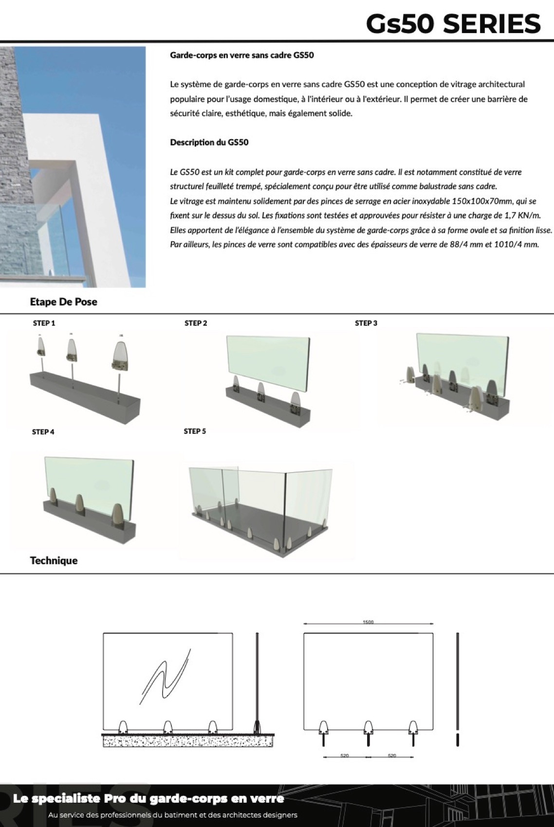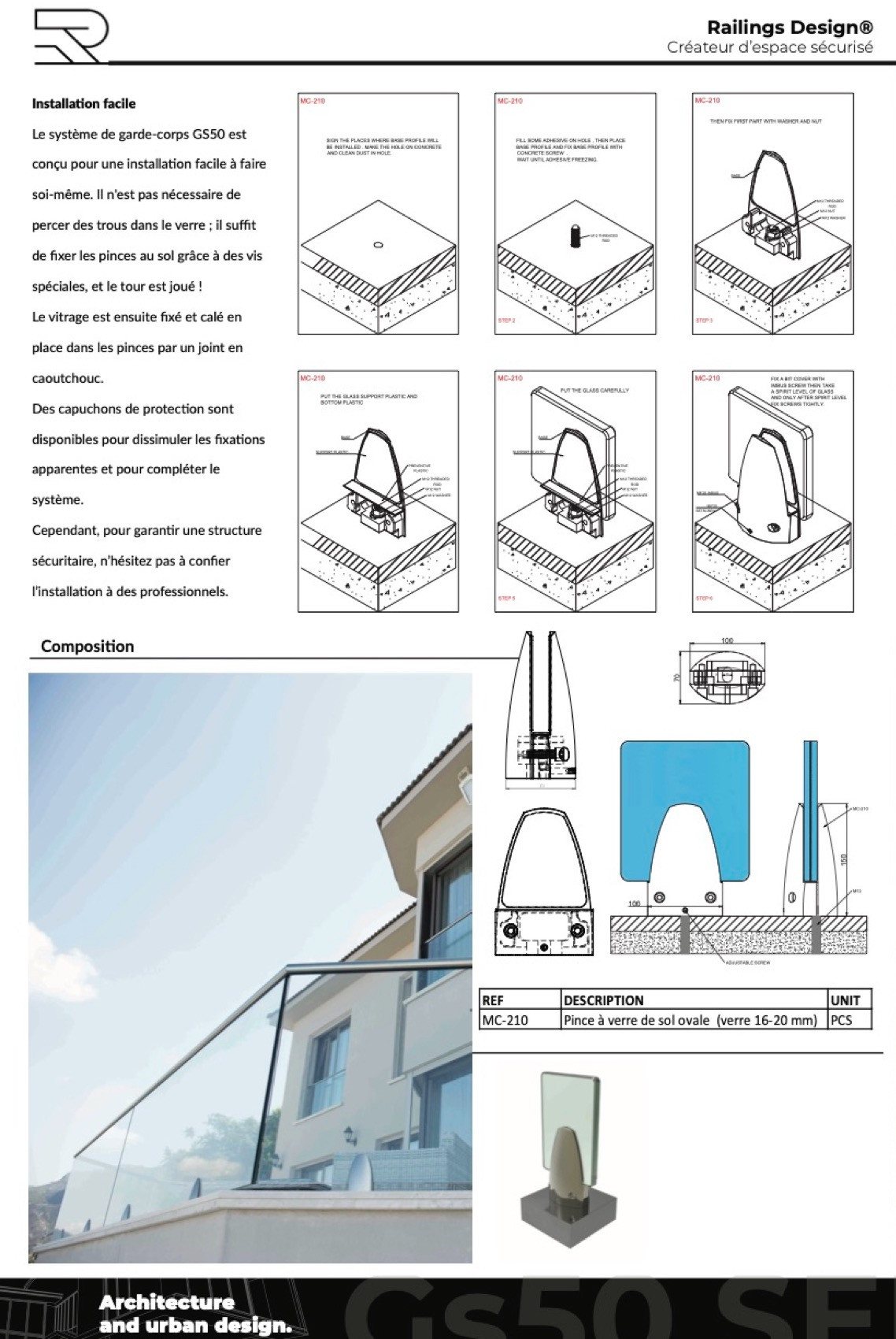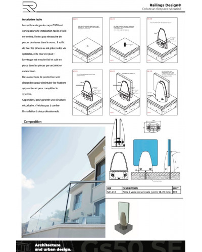 The GS50 is a frameless glass railing system offering modern aesthetics and an unobstructed view of the environment. Ideal for balconies, terraces and swimming pools, it combines safety with elegant design. Designed for building professionals and discerning homeowners.